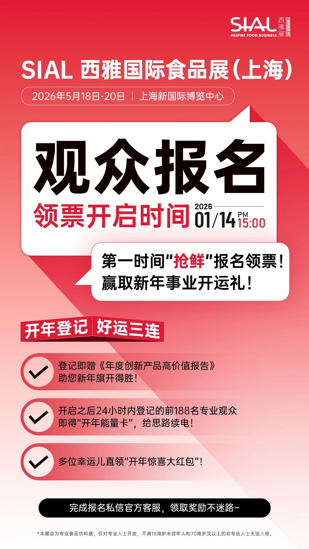 2026年5月18-20日,作为SIAL世界三大食品展之一的SIAL西雅国际食品展(上海)将在上海新国际博览中心盛大举办!这不仅是品牌进入中国、对接全球买家的首选平台,更是您洞察全球趋势、采购全球产品、建立全球供应链的绝佳贸易与创新生态平台。 20万㎡ 展览面积,18大主题全覆盖 汇聚全球 125个国家和地区的5,000+实力展商 吸引75个国家和地区的180,000+专业人士共赴盛会 全球观众报名通道将于2026年1月14日15点正式上线! 这不仅是全球食品行业的年度盛会,更是您开年寻商机、拓人脉、窥趋势的关键一跃。我们特别为您备下了 “新年事业开运三重礼” ,助您2026,从起点赢到高点! 第一重:旗开得胜礼 抢先完成登记,即可免费领取《年度创新产品高价值报告》电子版手册。这份报告源于全球展商与趋势创新洞察,是您预先掌握行业风向的“战略地图”。 第二重:能量满格礼 报名通道开启后的前24小时内,成功登记的前188名专业观众,将额外加赠专属 “开年能量卡”!为您的新年事业思路“充电续航”,灵感爆棚! 第三重:惊喜开运礼 我们还将从所有完成报名领票的专业观众中,随机抽取多位“天选幸运儿”,直送 “开年惊喜大红包” ! 重要提示:奖励领取须知 1、所有上述奖励,均需在完成正式报名后,私信展会官方客服,凭报名成功凭证领取。 2、本展会为专业食品饮料展,仅对专业人士开放。不满18周岁未成年人和70周岁及以上的非专业人士无法入场。 锁定官方渠道,第一时间“抢鲜”报名领票! 标星我们会更加方便收取官方第一时间最新消息,进入公众号主页还可查看历史发布的全部文章哦!